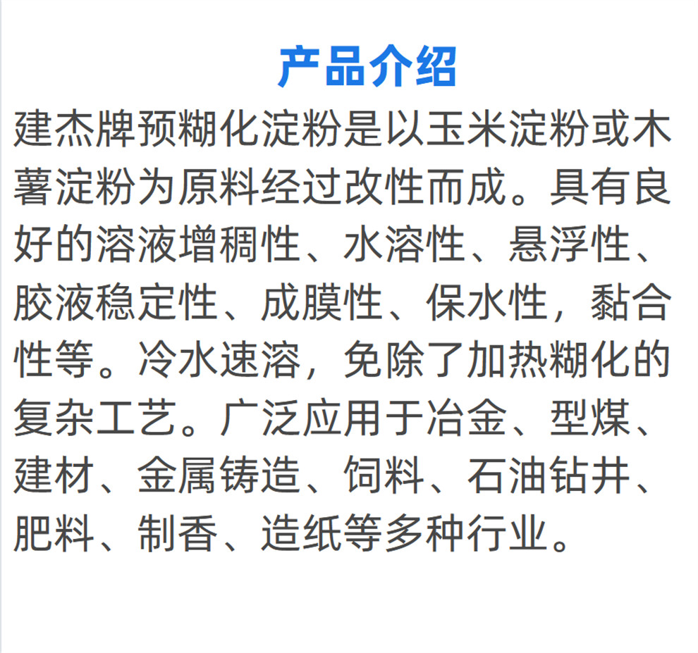 產(chǎn)品介紹:建杰牌預(yù)糊化淀粉是以玉米淀粉為原料經(jīng)過改性而成。具有良好的溶液增稠性、水溶性、懸浮性、膠液穩(wěn)定性、成膜性、保水性,黏合性等。冷水速溶,免除了加熱糊化的復(fù)雜工藝。廣泛應(yīng)用于冶金、型煤、建材、金屬鑄造、飼料、石油鉆井、肥料、制香、造紙等……